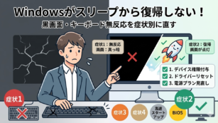 Windowsがスリープから復帰しない・画面が真っ暗なまま動かない原因と直し方を症状別に解説!「キーボードが無反応」「モニターだけ映らない」「すぐスリープに落ちる」など、パターン別の対処法を網羅。高速スタートアップの無効化やコマンドでの原因特定など、在宅ワーク中に困るトラブルを即解決します。