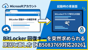 Windows 【Windows11】BitLocker回復キーを突然求められる原因と直し方|勝手にロックされる時の対処法 Windows11の更新(KB5083769等)後に、突然BitLocker回復キーを求められる原因と直し方を分かりやすく図解。勝手にロックされた時の48桁の回復キーの見つけ方、入力手順、今後ロックを繰り返さないための設定まで完全ガイドします。 2026.05.01 Windows