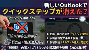 新しいOutlookでクイックステップが消えた原因と設定方法を2026年版で解説。旧Outlookからの引き継ぎができない理由や、設定しても表示されない・消える場合のチェックリスト、メール作成テンプレートの代替手段(マイテンプレート)まで図解で詳しく紹介します。