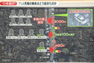 乗用車を運転していた男は現場から逃走し、警察はひき逃げ事件(11人死傷)として捜査。