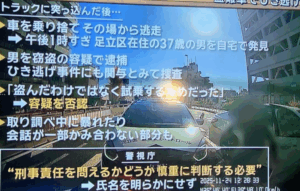 37歳の男は事件直前に現場近くの自動車販売店(TOYOTA認定中古車店)から白いセダンタイプの乗用車を無断で持ち出して、ひき逃げ事件を起こしました。