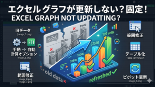 Excelでデータを変更したのにグラフが更新されない・反映されない時の原因と対処法を症状別に解説。計算方法が「手動」になっている、データ範囲のズレ、ピボットテーブルの更新忘れなど、よくある落とし穴を網羅。再発防止に役立つ「テーブル機能」の活用術も紹介します。