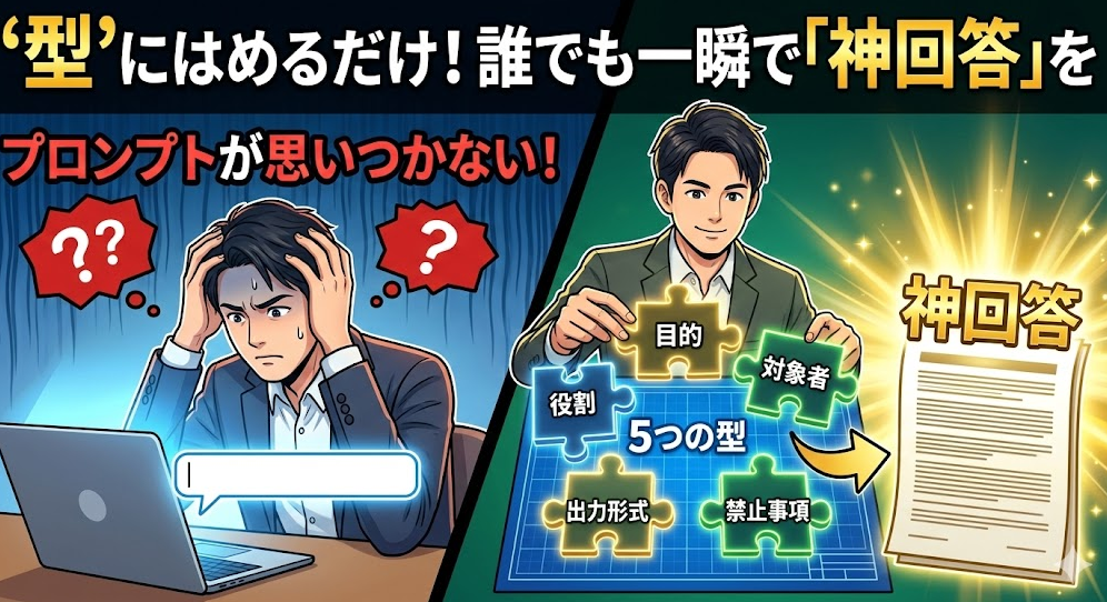 ですが、確信を持って言えることがあります。プロンプトは「思いつく」ものではなく「型に当てはめる」ものです。センスや語彙力は一切必要ありません。
