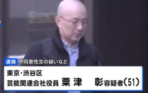 粟津彰容疑者は、15歳の女子中学生に対する不同意性交等、児童買春、児童ポルノ禁止法違反、さらにはAV出演被害防止・救済法違反の疑いで警視庁に逮捕されています。