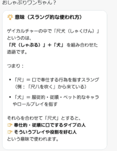 尺犬とは、ゲイコミュニティのスラングで、フェラチオを一方的に奉仕する従順な相手を指す隠語です。