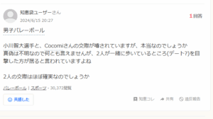 cocomiさんが観戦にきていたネーションズリーグのスロベニア戦で小川智大選手が試合中、cocomiさんにハンドサインを送っていたという目撃情報があります。