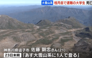 神奈川県逗子市に住む大学生、佐藤朝忠さん(21)が、大雪山系桂月岳(標高1938m)で雪の中に埋もれた状態で発見され、その場で死亡が確認されました。