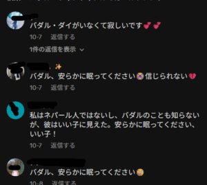 動画には亡くなったバダルさんを追悼するコメントが続々と投稿されていました。