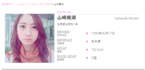 こちらのプロフィールと一致する同姓同名の「山崎南湖」さんがミスコンテスト「FRESH CAMPUS CONTEST 2015」(通称:フレキャン)に出場していました。