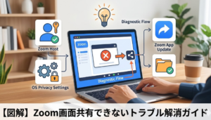 Zoom会議中に「画面共有ボタンが押せない」「画面が真っ暗になる」といったトラブルは、リカレント教育のオンライン講義やリモートワークで最も焦る瞬間の一つです。